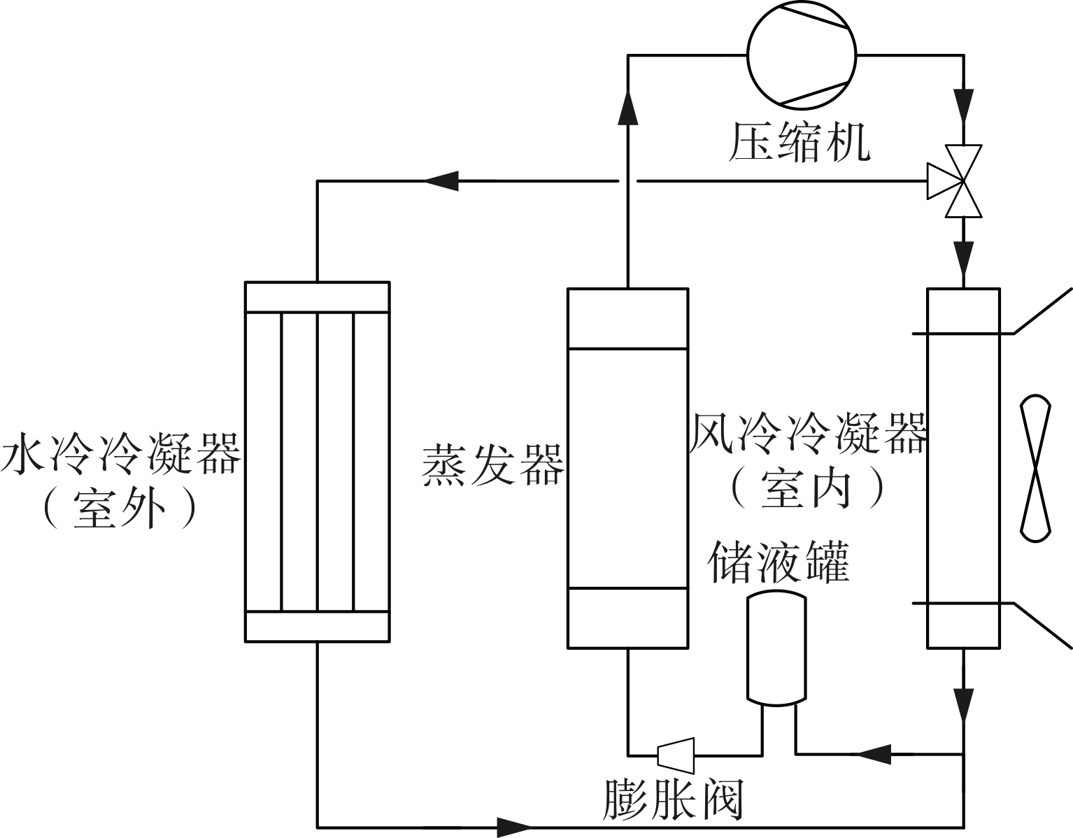(1)由压缩机加压后的制冷剂通过三通阀,一部分流向室内的风冷冷凝器,一部分流向室外的水冷冷凝器,根据室内调温范围,通过三通阀调节制冷剂流量。风冷冷凝器和水冷冷凝器中的制冷剂再汇集在储液罐,经过膨胀阀流向蒸发器。zui后流向压缩机,形成一个完整的循环。