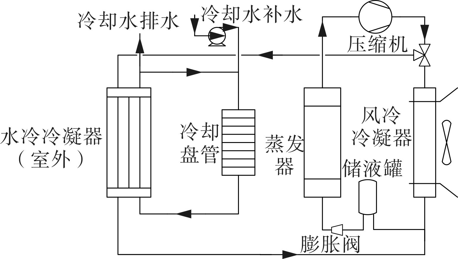 (2)水冷冷凝器中,温度在室内露点温度与室温之间的冷水进入冷却盘管对空气进行降温处理;再进入水冷冷凝器,冷水和制冷剂逆流,达到对制冷剂降温的效果。