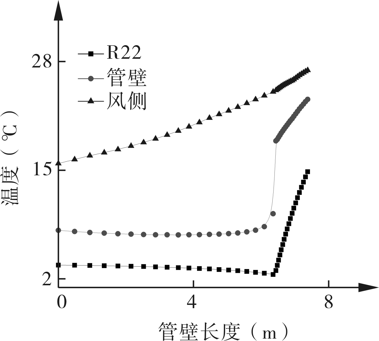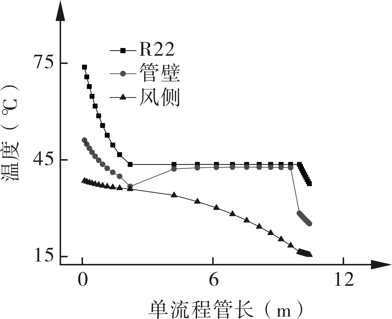 图6为水冷冷凝器管壁及制冷和水侧的沿程温度分布。