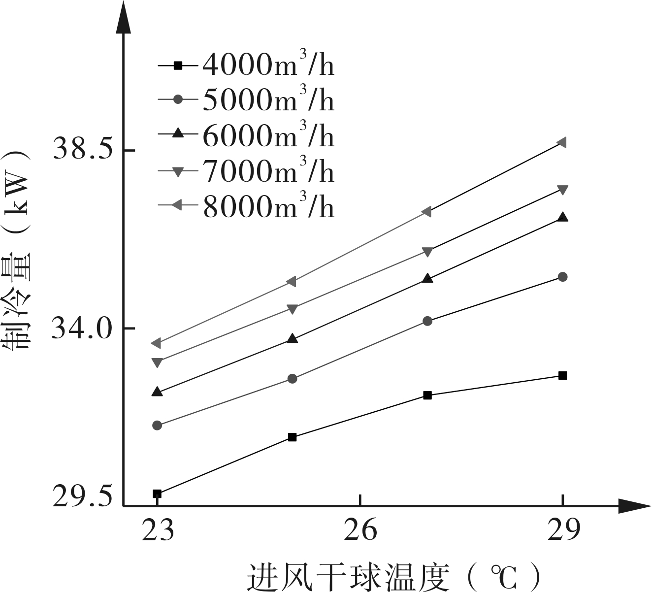 图9 不同风量下进风干球温度对制冷量的影响