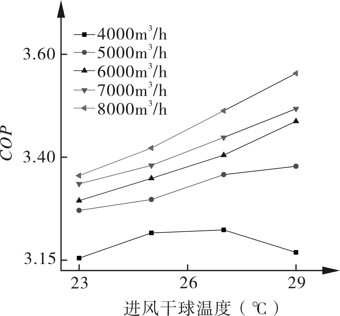 图10 不同风量下进风干球温度对COP的影响