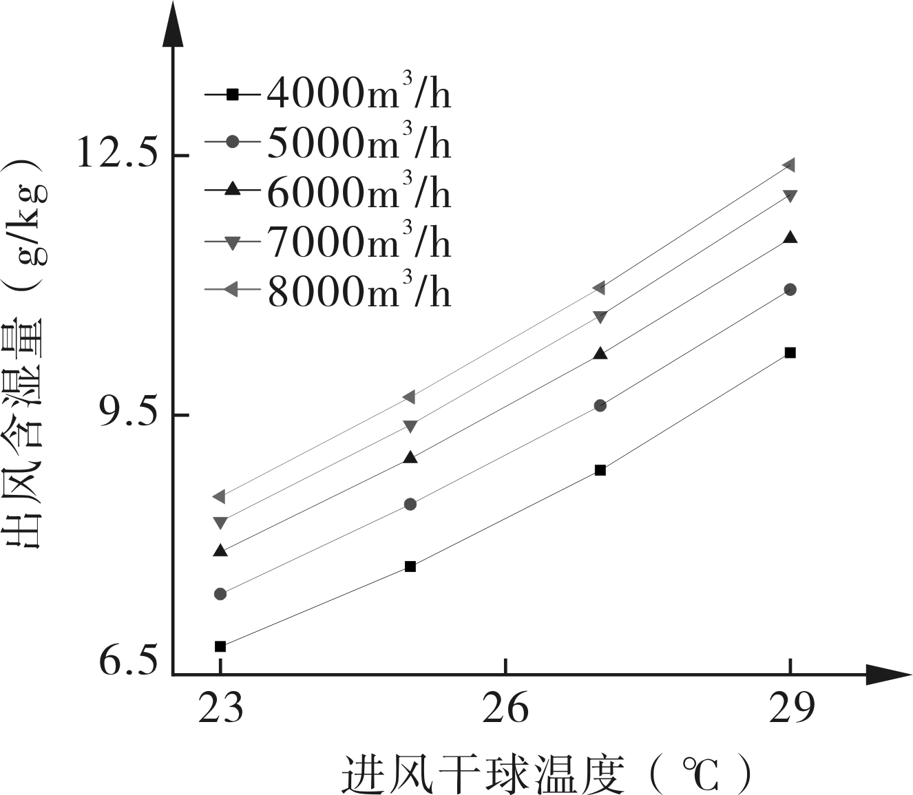 图11 不同风量下进风干球温度对出风含湿量的影响