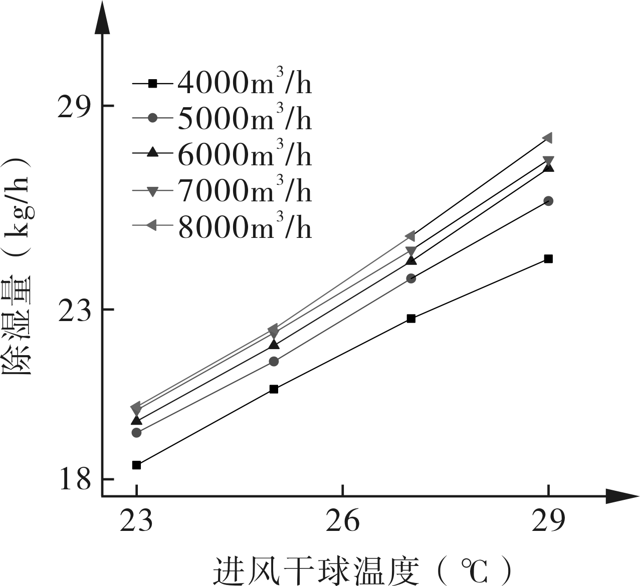图12 不同风量下进风干球温度对除湿量的影响