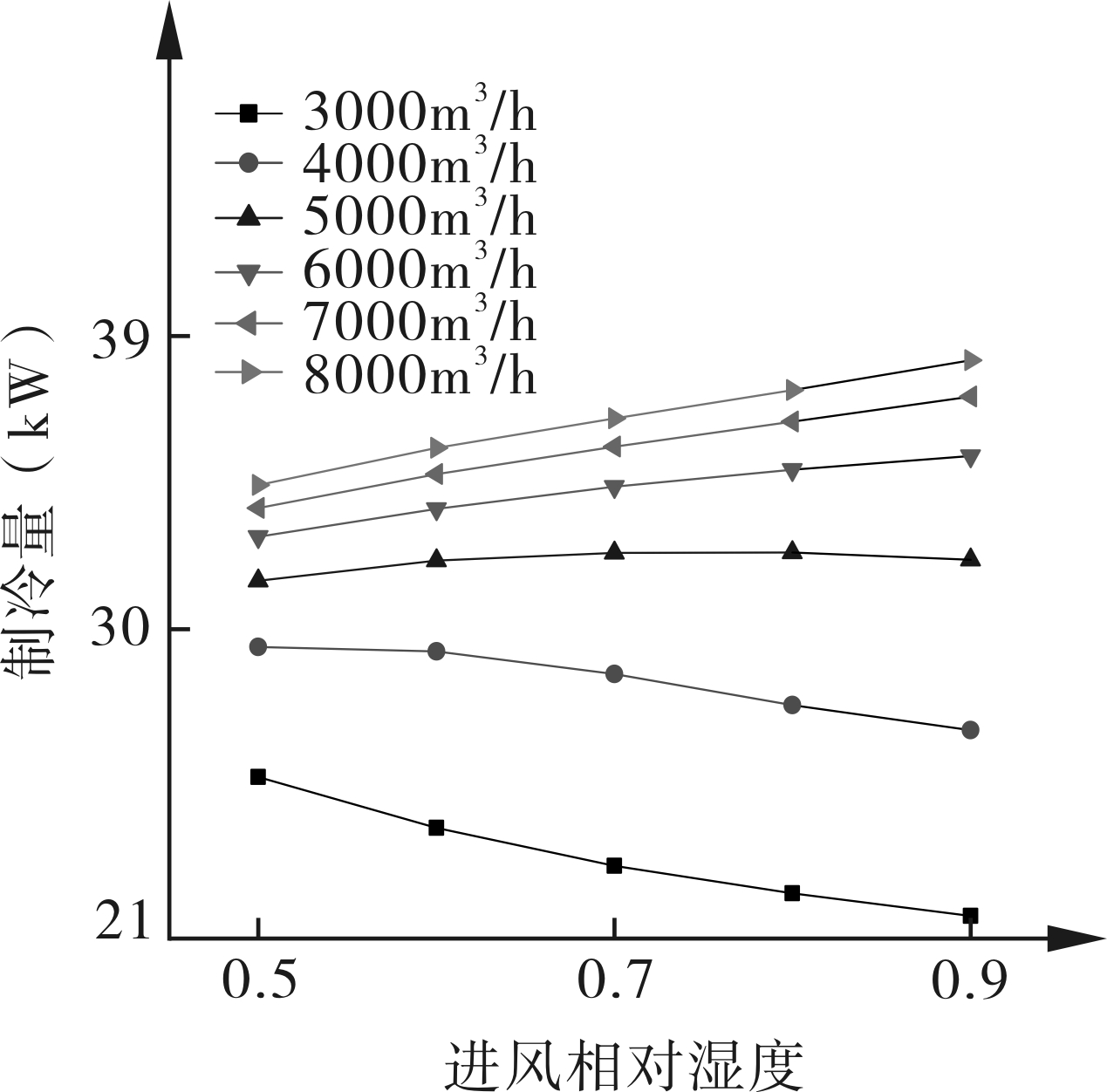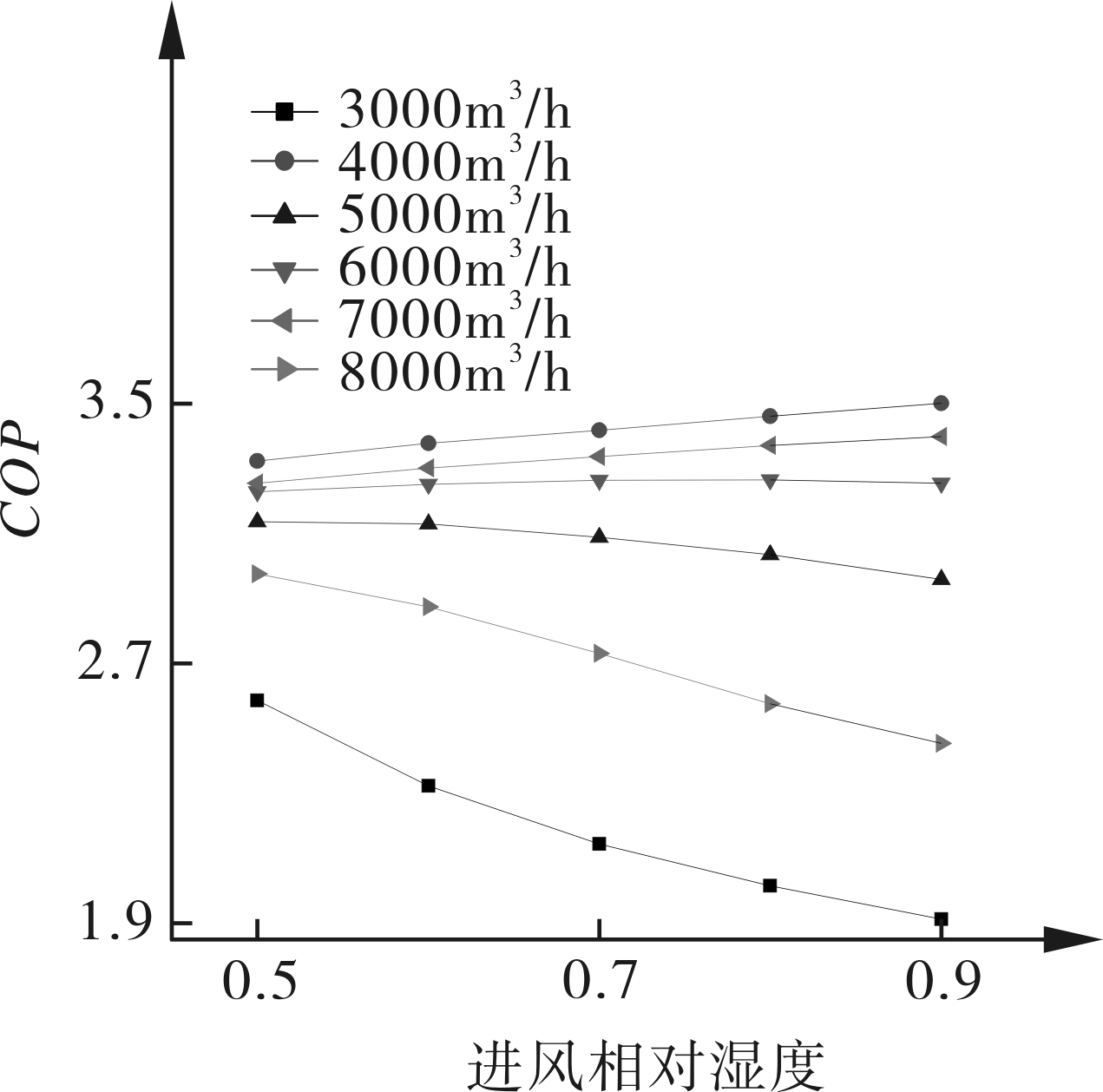 从图13~16中可以看出,当进风相对湿度增加,除湿量增加,制冷量在风量较大时,随着进风相对湿度的增加而增加,而风量较小时,则出现制冷量下降的趋势。COP也有相应的下降趋势。