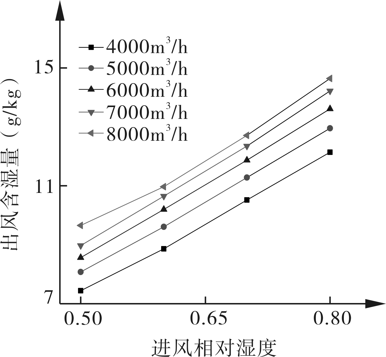 图15 不同风量下进风相对湿度对出风含湿量的影响