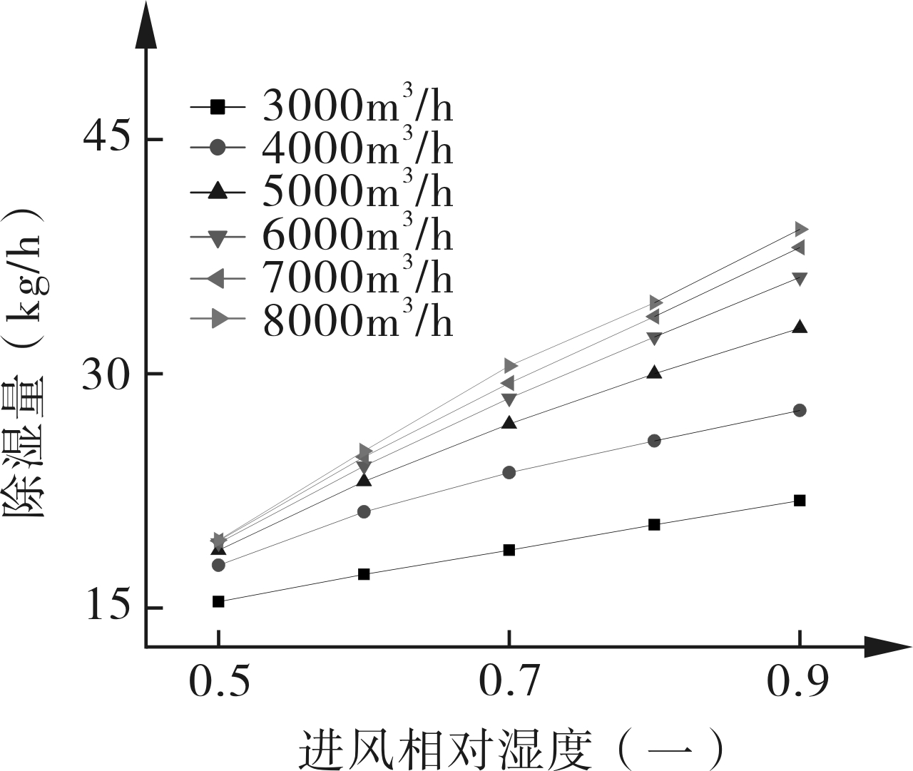 图16 不同风量下进风相对湿度对除湿量的影响