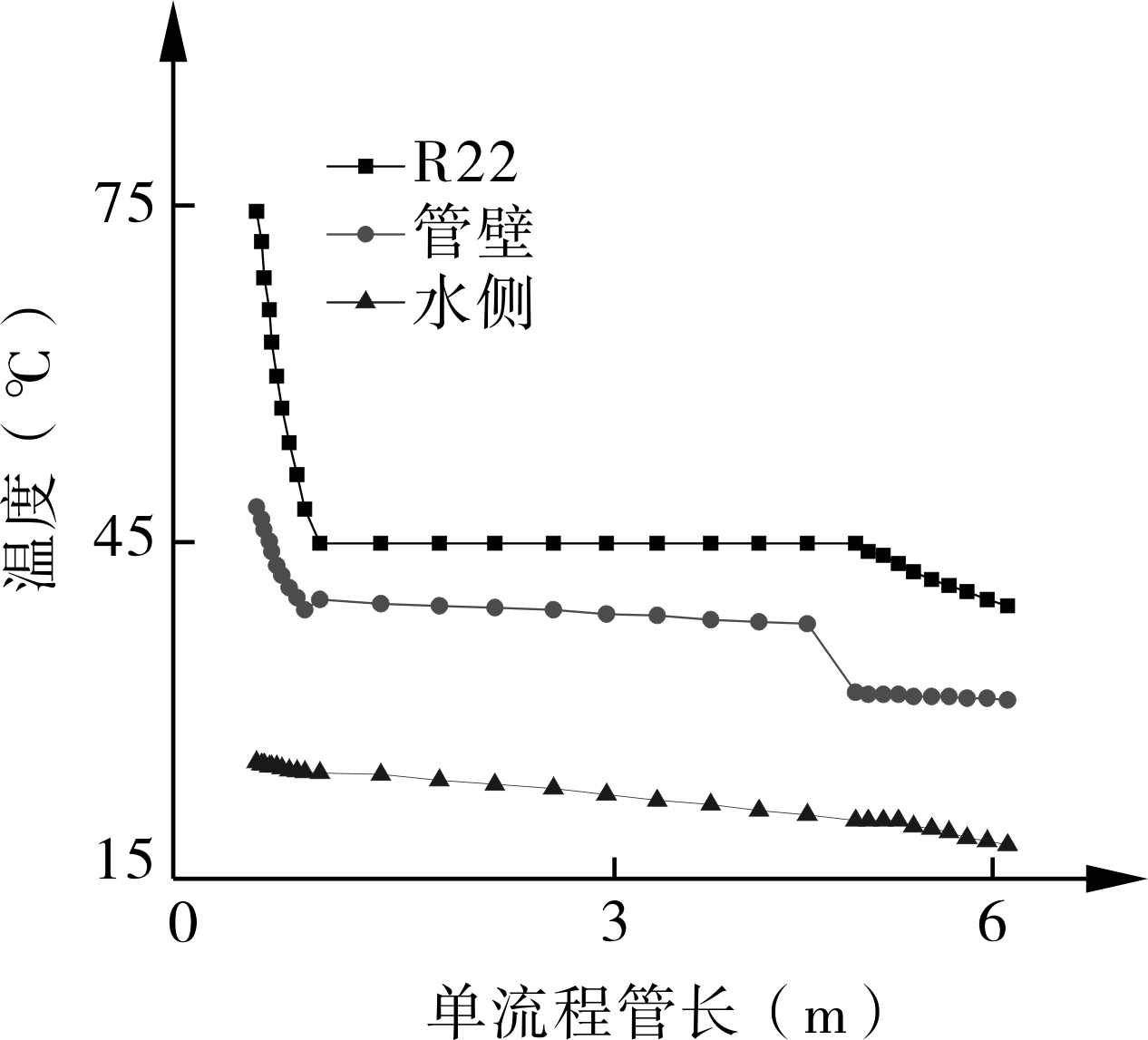 图6 水冷冷凝器管壁及制冷剂和水侧的沿程温度分布